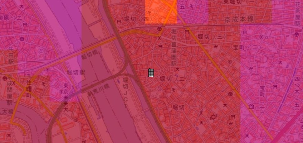 ●東京都の「地震に関する地域危険度測定調査」によると、「堀切2丁目」の地域危険度は“5”(※)であり、災害リスクが最悪レベルの地域です。