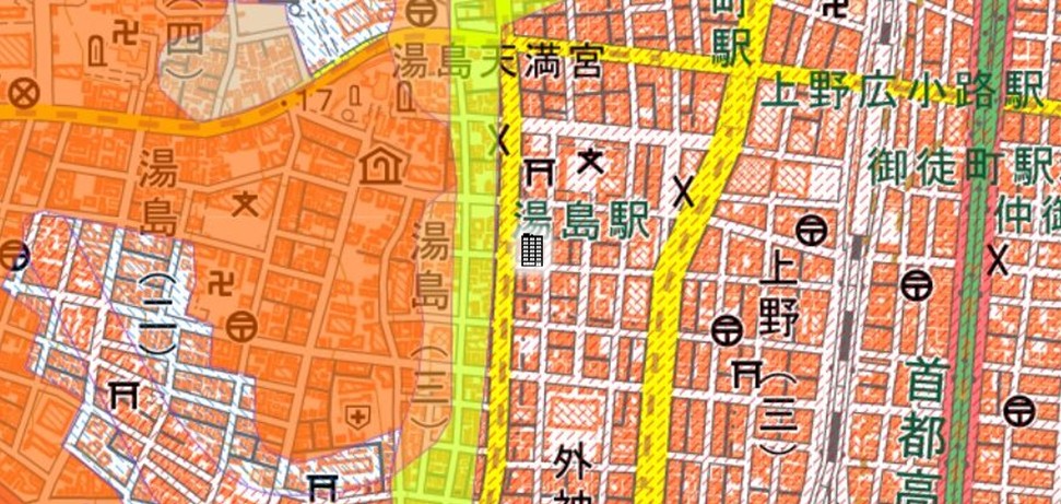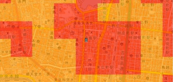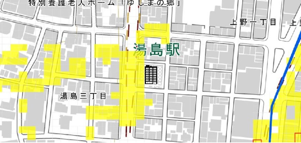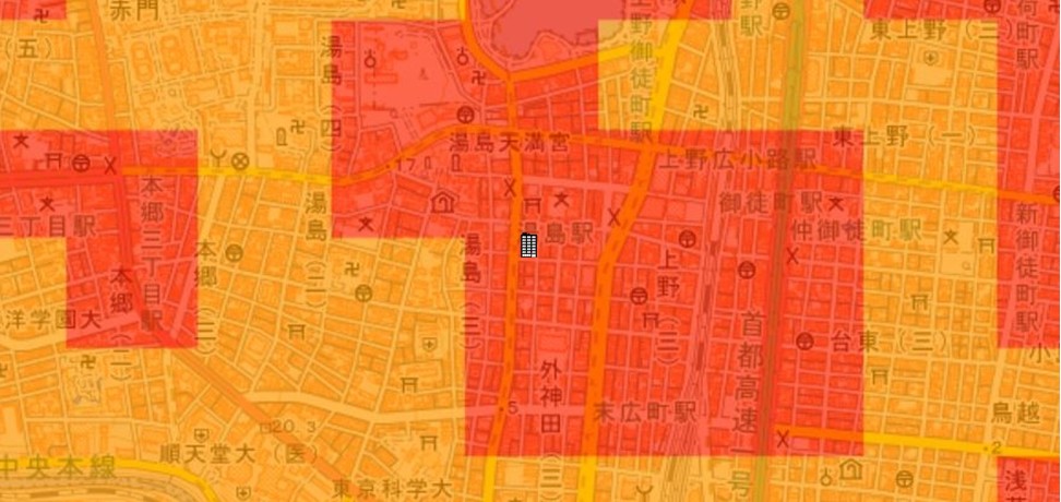 ●東京都の「地震に関する地域危険度測定調査」によると、「上野1丁目」の地域危険度は“2”(※)であり、災害に比較的強い地域であるとされています。