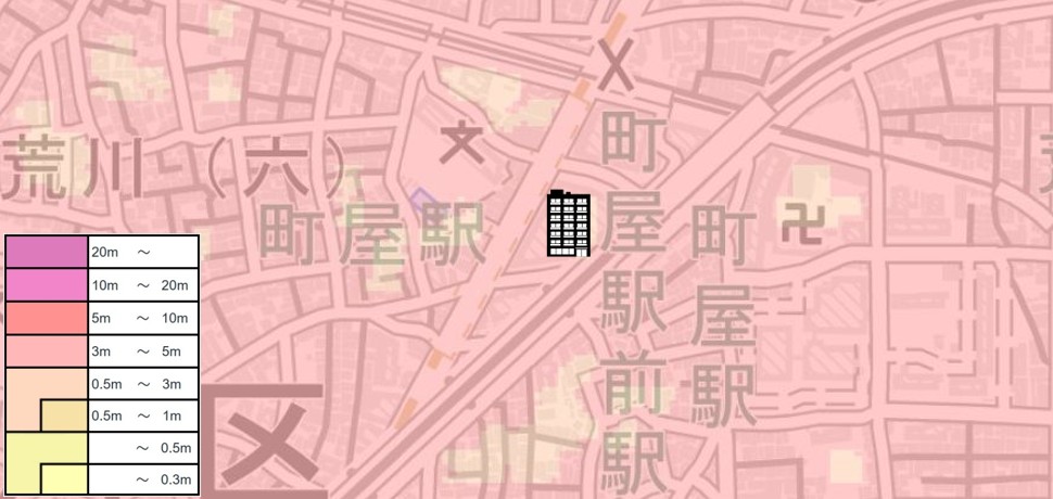 低地帯に位置し、3m以上の浸水可能性が指摘されているので、浸水リスクは非常に大きいです。