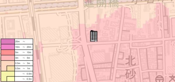 「海抜ゼロメートル地帯」に位置し、5m超の浸水可能性が指摘されているので、浸水リスクは非常に大きいです。