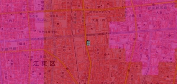 ●東京都の「地震に関する地域危険度測定調査」によると、「北砂3丁目」の地域危険度は“5”(※)であり、災害リスクが最悪レベルの地域であるとされています。