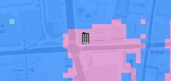 ●ただ、対象地の周辺は、商業施設や病院、物流施設等の大きな建物がまとまっているエリアであり、地域の災害リスクの影響を受ける程度は低いでしょう。