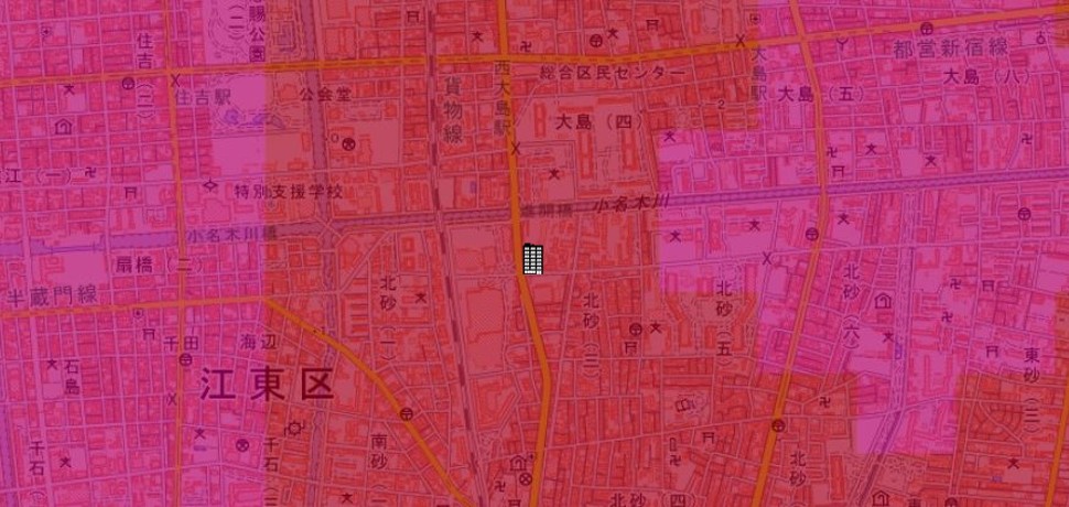 ●東京都の「地震に関する地域危険度測定調査」によると、「北砂3丁目」の地域危険度は“5”(※)であり、災害リスクが最悪レベルの地域であるとされています。