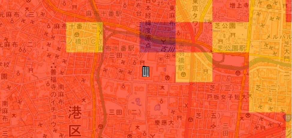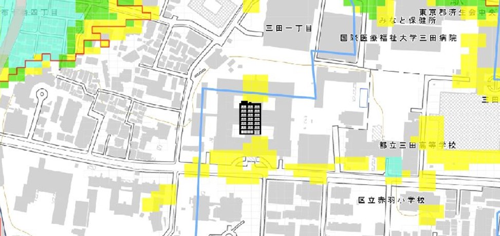 東京都の「地震に関する地域危険度測定調査」によると、「三田1丁目」の地域危険度は“1”(※)であり、災害に強い地域であるとされています。