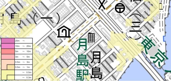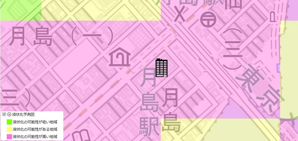 東京都建設局が公開している「東京の液状化予測図」では、「液状化の可能性が高い地域」に含まれています。
