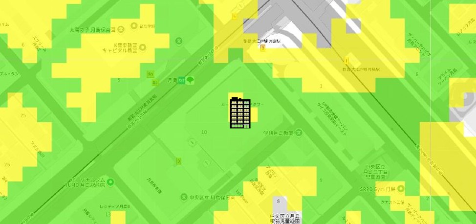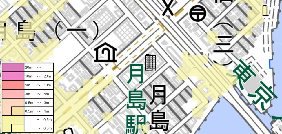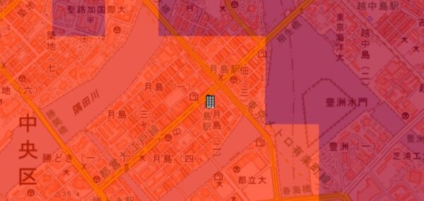 東京都の「地震に関する地域危険度測定調査」によると、「月島2丁目」の地域危険度は“2”(※)であり、災害リスクが多少残る地域であるとされています。