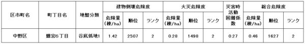●東京都の「地震に関する地域危険度測定調査」によると、「鷺宮6丁目」の地域危険度は“2”(※)であり、災害に比較的強い地域であるとされています。