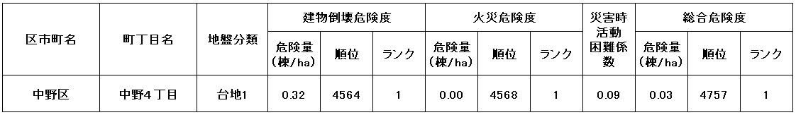 ●東京都の「地震に関する地域危険度測定調査」によると、「中野4丁目」の地域危険度は“1”(※)であり、災害に強い地域であるとされています。