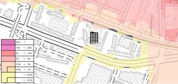 荒川に近接する埋立地に位置し、高潮で約0.6mの浸水可能性が指摘されているので、浸水リスクは顕在です。
