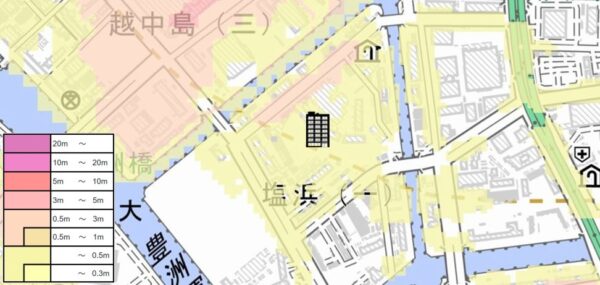 標高2m未満の湾岸の埋立地に位置し、2mを超える浸水可能性が指摘されているので、浸水リスクは大きいです。