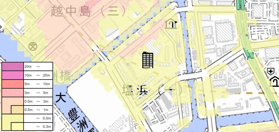 | 浸水深 | [高潮]約2.3m [内水氾濫・洪水]0.5m~3m |