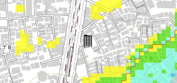 多少の地盤リスクがあると思われる場所ですが、建物は概ねシンプルな形状のRC造なので、地震の際に大きな被害が生じる可能性は低いと判断します。