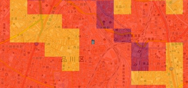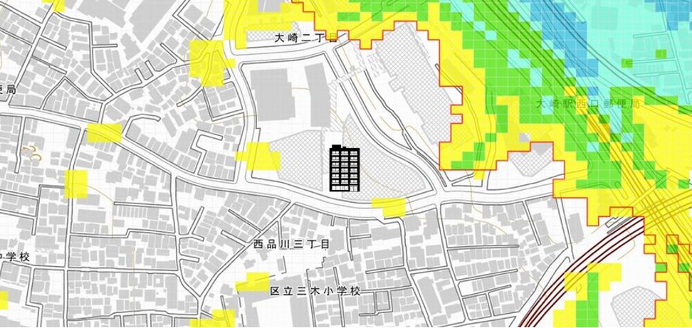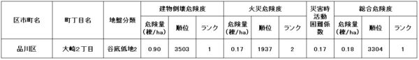 ●東京都の「地震に関する地域危険度測定調査」によると、「大崎2丁目」の地域危険度は“1”(※)であり、災害に強い地域であるとされています。