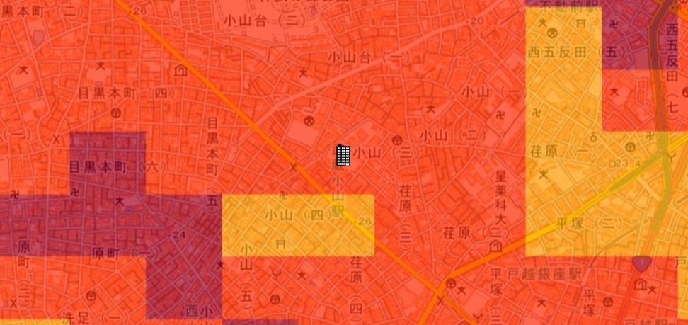 ●東京都の「地震に関する地域危険度測定調査」によると、「小山3丁目」の地域危険度は“2”(※)であり、災害に比較的強い地域であるとされています。