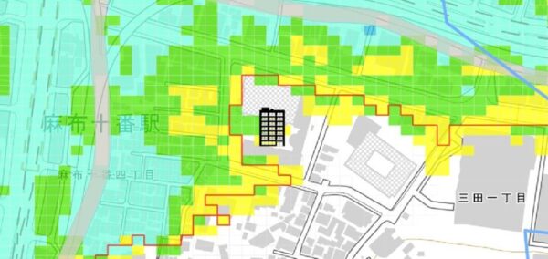 ●12万年前~16万年前に作られたという「埋没谷(東京層下部基底面)」の範囲に該当しますので、大地震時の揺れが大きくなる可能性があります。