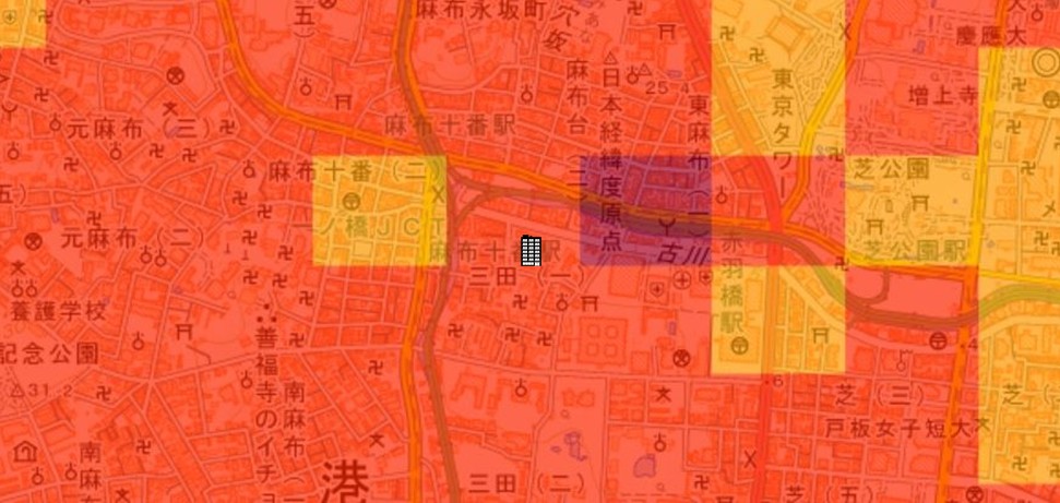 ●東京都の「地震に関する地域危険度測定調査」によると、「三田1丁目」の地域危険度は“1”(※)であり、災害に強い地域であるとされています。