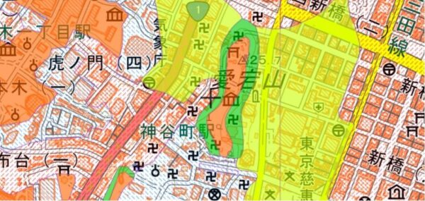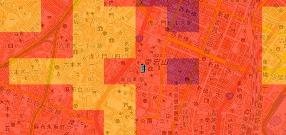 愛宕山下の低地に位置しますが、浸水可能性の指摘は低い数値なので、大きな浸水リスクはないと判断します。