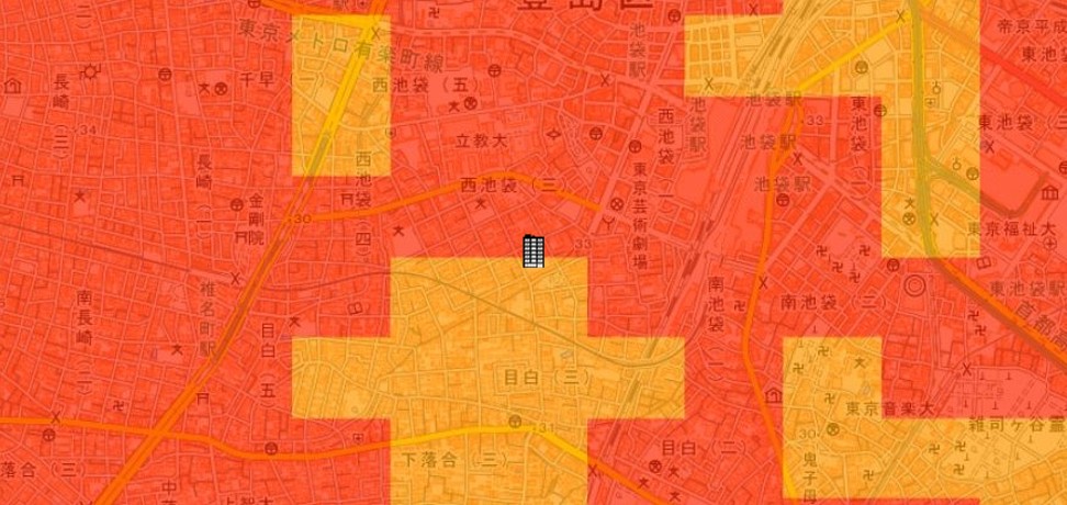 ●東京都の「地震に関する地域危険度測定調査」によると、「西池袋2丁目」の地域危険度は“3”(※)であり、災害リスクが多少残る地域であるとされています。