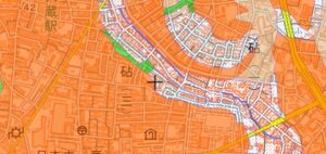 | 【対水害の評価】 [標高・立地] ●標高38m~41mの傾斜地(地形的には大部分は切土地、一部台地)に位置します。 〔浸水深〕 ●敷地の一部に約0.8mの浸水可能性の指摘があります。内水氾濫にしては大きな数字です。 〔対水害総評〕 ●標高や下水道台帳を確認する限り、そこまで大きな浸水リスクがあるようには見えませんが、用途地域の高さ制限内に4階建相当の建物を収めるために、敷地を掘削した影響だと思われます。 ●また、浸水リスクとしては想定されていませんが、北東方を流れる谷戸川沿いで浸水深2mを指摘されている場所と対象地の標高差は約2mです。予想を超える大雨で谷戸川が溢水した場合には、想定外の浸水被害があり得るものと考えておくべきでしょう。 ●谷戸川河岸と標高差がさほどない場所に位置し、約0.8mの浸水可能性が指摘されているので、浸水リスクを無視できません。 |