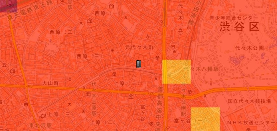 東京都の「地震に関する地域危険度測定調査」によると、「元代々木町」の地域危険度は”2”(※)となっており、災害に比較的強い地域であるとされています。