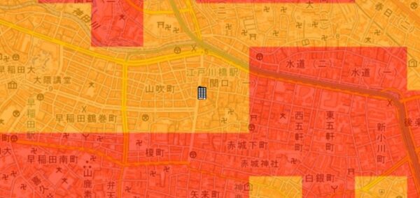 神田川の氾濫浸水区域内に位置し、3m超の浸水可能性が指摘されているので、浸水リスクは非常に大きいです。