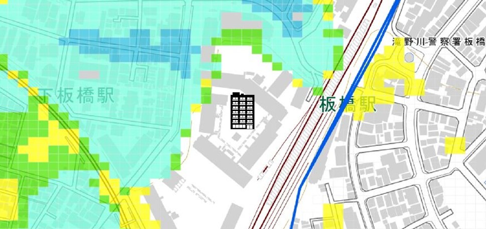| 【対水害の評価】 [標高・地形] ●標高約24m~26m、台地と谷底低地に挟まれた切土地にあります。 ●すぐ北側が現在は暗渠となっている谷端川流域に当たります。 〔浸水深〕 ●内水氾濫等により、敷地の一部に最大1.8mの浸水可能性が指摘されています。 〔対水害総評〕 ●敷地の一部が、暗渠である谷端川流域にかかり、約1.8mの浸水可能性が指摘されているので、浸水リスクは顕在です。 ●想定を超える大雨が降った場合には、浸水被害が拡大する可能性のある立地です。 |