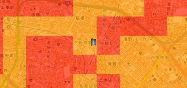 ●しかし、すぐ北側のエントランスのある板橋区板橋1丁目は92件と“5段階で最悪レベル”なので、注意が必要です。