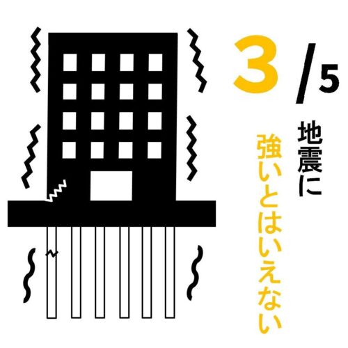 | 【対地震の評価】 [地盤] ●地中深くで埋没谷のように柔らかい地層が連続する地層があるので、地盤の良い場所とはいえません。 〔建物〕 ●どっしりとした形状なので、建物自体に大きな損壊リスクはないと判断します。 〔対地震総評〕 ●埋没谷のような地層がみられるため、地盤リスクがないとはいえない場所です。どっしりとした形状のマンションですが、地盤の良い場所に建つマンションと比較したら、損傷リスクは高いでしょう。 |