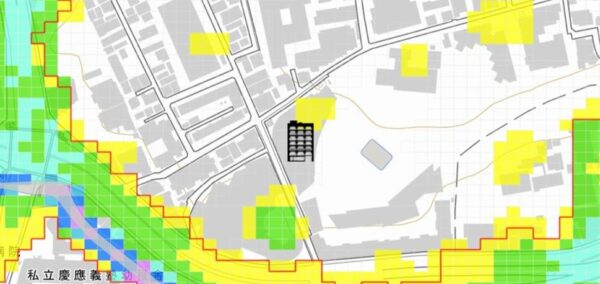 | 【対水害の評価】 [標高・地形] ●標高約11m~19m、台地斜面から谷底低地に至る傾斜地に位置します。 ●敷地の西側は、暗渠である笄川(こうがいがわ)と古川の合流地点付近に広がる谷底低地です。 ●谷底低地は、昔、川が流れることで形成された地形なので、大雨の際は水が集まる傾向があります。 〔浸水深〕 ●敷地の一部に、約0.4mの浸水可能性が指摘されています。 ●指摘箇所は、敷地の中では標高の高い部分、地形としては台地斜面にあたると思われます。 〔対水害総評〕 ●内水氾濫としては少し大きな数値ですが、東京都下水道局が公開している下水道台帳を見ても、当該浸水可能性の根拠が判然としません。 ●標高・地形等からみて、大きな浸水リスクはないと判断します。 ●想定を超える大雨が降った場合は、浸水被害が拡大する可能性があります。 |
