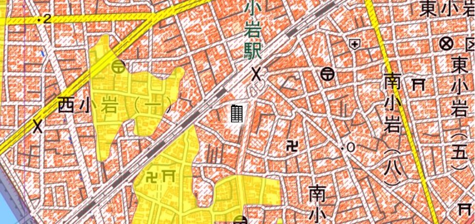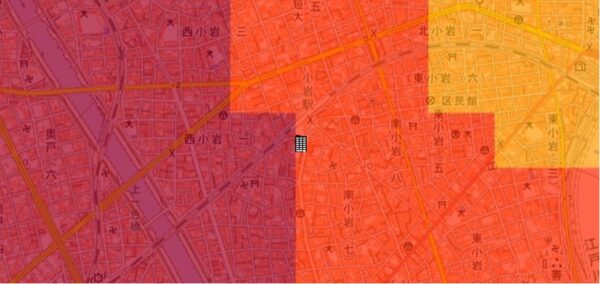 東京都の「地震に関する地域危険度測定調査」によると、「南小岩6丁目」の地域危険度は“4”(※)であり、災害リスクが大きい地域であるとされています。