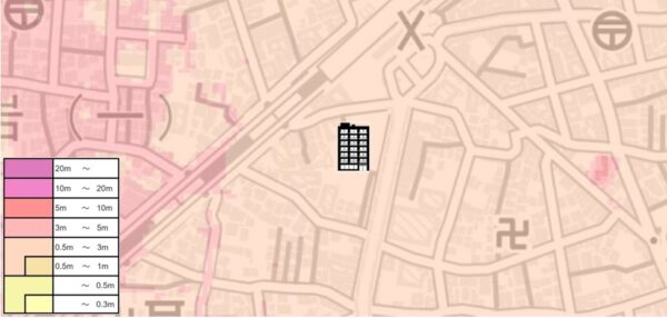 標高2m弱の低地帯に位置し、高潮で約1.8m等の浸水可能性が指摘されているので、浸水リスクは大きいです。