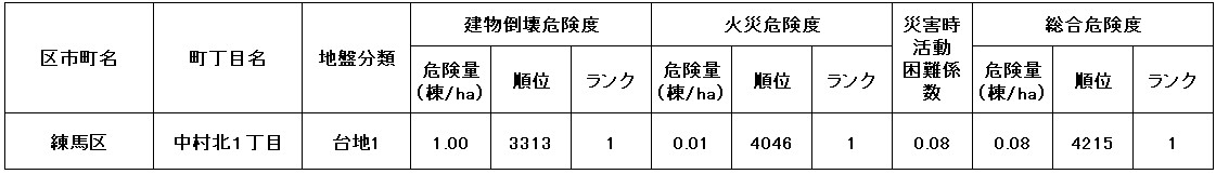 ●東京都の「地震に関する地域危険度測定調査」によると、「中村北1丁目」の地域危険度は“1”(※)であり、災害に強い地域であるとされています。