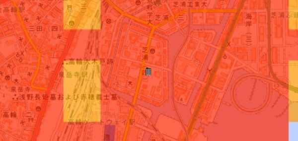 ●東京都の「地震に関する地域危険度測定調査」によると、「芝浦4丁目」の地域危険度は“1”(※)であり、災害に強い地域であるとされています。