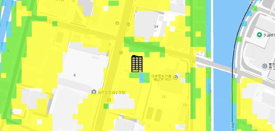 | 【対水害の評価】 [標高・地形] ●標高3m余りの湾岸の埋立地に位置します。 〔浸水深〕 ●高潮により最大約1.3mの浸水可能性が指摘されています。 ●内水氾濫・洪水により、敷地の周縁部に0.5m未満の浸水可能性が指摘されています。 〔対水害総評〕 ●湾岸の埋立地に位置し、高潮で約1.3m等の浸水可能性が指摘されているので、浸水リスクは顕在です。 ●想定を超える高潮や大雨が発生した場合には、浸水被害が拡大する可能性のある立地です。 |