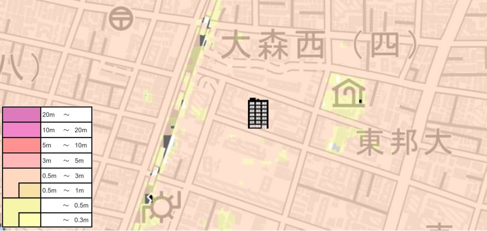 | 【対水害の評価】 [標高・地形] ●標高3m前後、多摩川河口周辺に広がる低地に位置します。 〔浸水深〕 ●高潮により最大約0.7mの浸水可能性が指摘されています。 ●洪水・内水氾濫により0.5m~3m未満の浸水可能性が指摘されています。 〔対水害総評〕 ●標高3m程度の低地に位置し、0.5m以上の浸水可能性が指摘されているので、浸水リスクは顕在です。 ●想定を超える高潮・大雨が発生した場合には、浸水被害が拡大する可能性のある立地です。 |