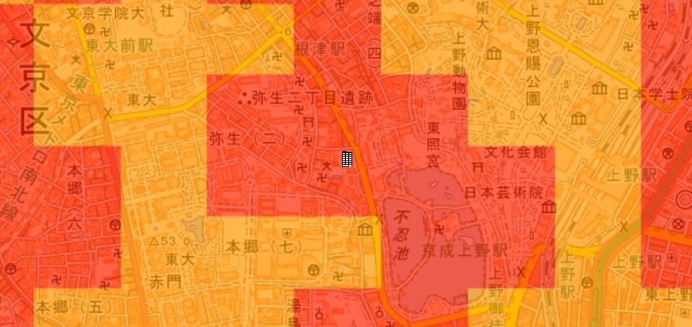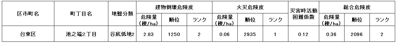 ●東京都の「地震に関する地域危険度測定調査」によると、「池之端2丁目」の地域危険度は“2”(※)であり、災害に比較的強い地域であるとされています。