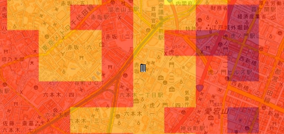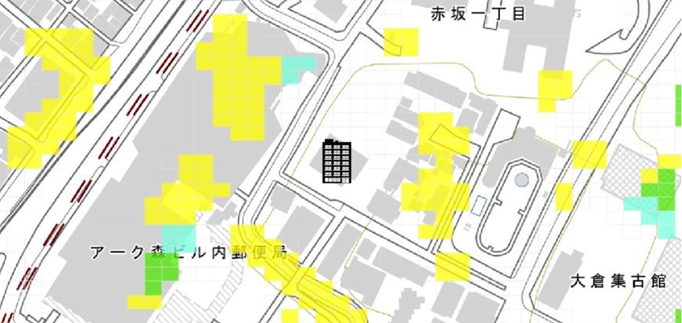 ●東京都の「地震に関する地域危険度測定調査」によると、「赤坂1丁目」の地域危険度は“1”(※)であり、災害に強い地域であるとされています。