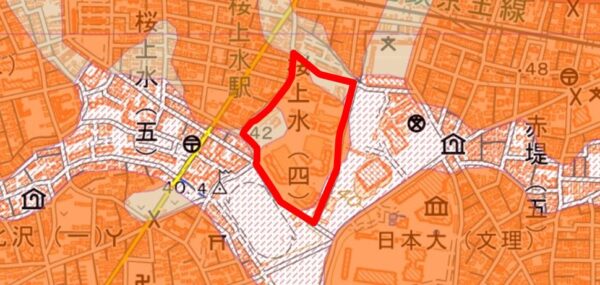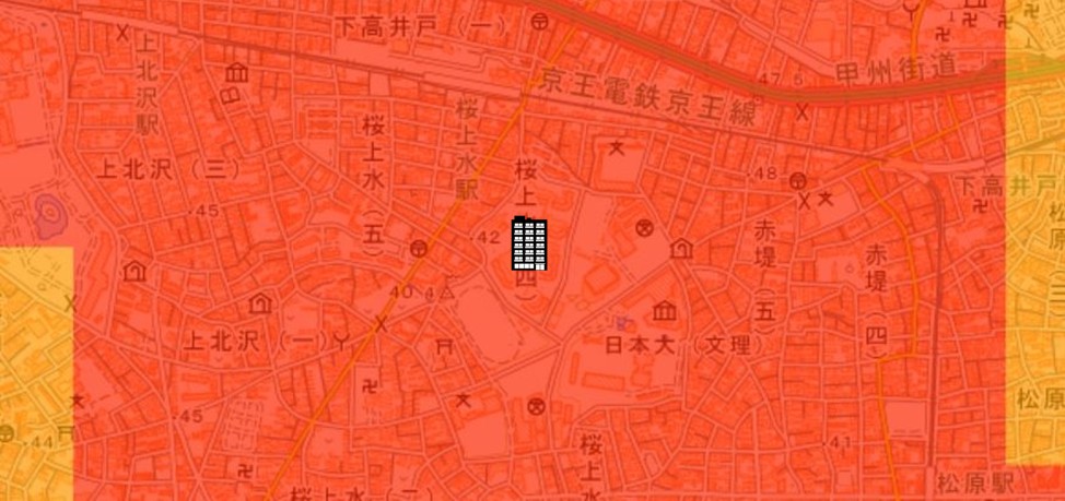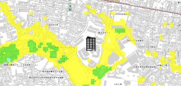 浸水想定がされている敷地の周縁部は暗渠となっている北沢川の川筋のようなので、想定を超える大雨が降った場合には、浸水被害が拡大する可能性があります。