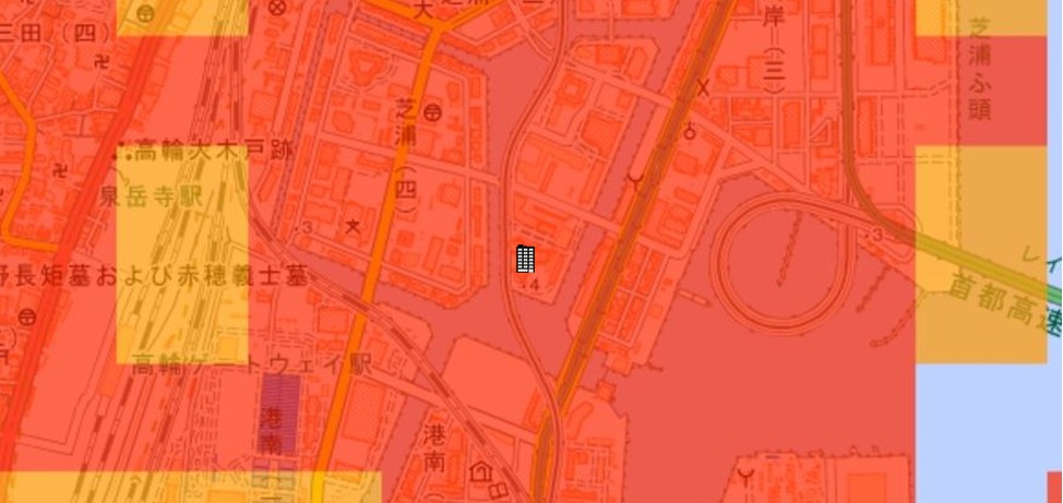 東京都の「地震に関する地域危険度測定調査」によると、「芝浦4丁目」の地域危険度は“1”(※)であり、災害に強い地域であるとされています。
