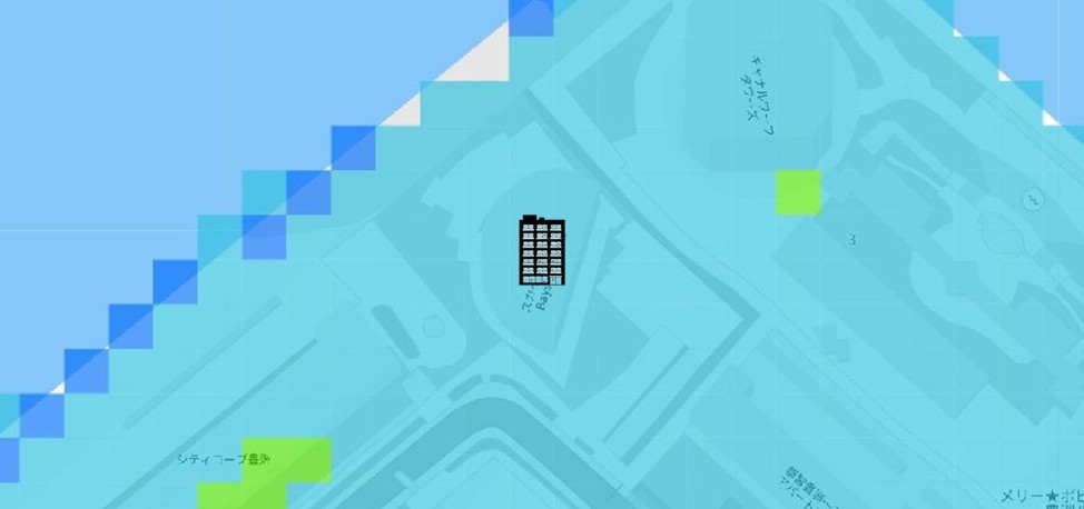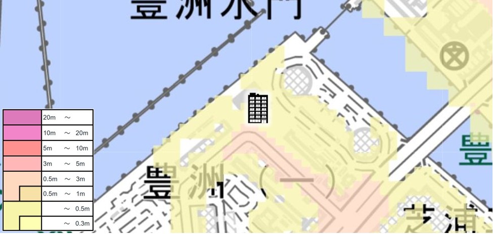 | 【対水害の評価】 [標高・地形] ●標高約2mの湾岸の埋立地に位置します。 〔浸水深〕 ●高潮により約1.4mの浸水可能性が指摘されています。 ●洪水・内水氾濫により0.5m未満の浸水可能性が指摘されています。 〔対水害総評〕 ●湾岸の埋立地に位置し、約1.4mの浸水可能性が指摘されているので、浸水リスクは大きいです。 ●昨今「想定外」の災害が毎年のように起きていることを想起しますと、ハザードマップの想定を超える事態もあり得ます。 |
