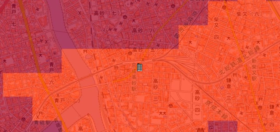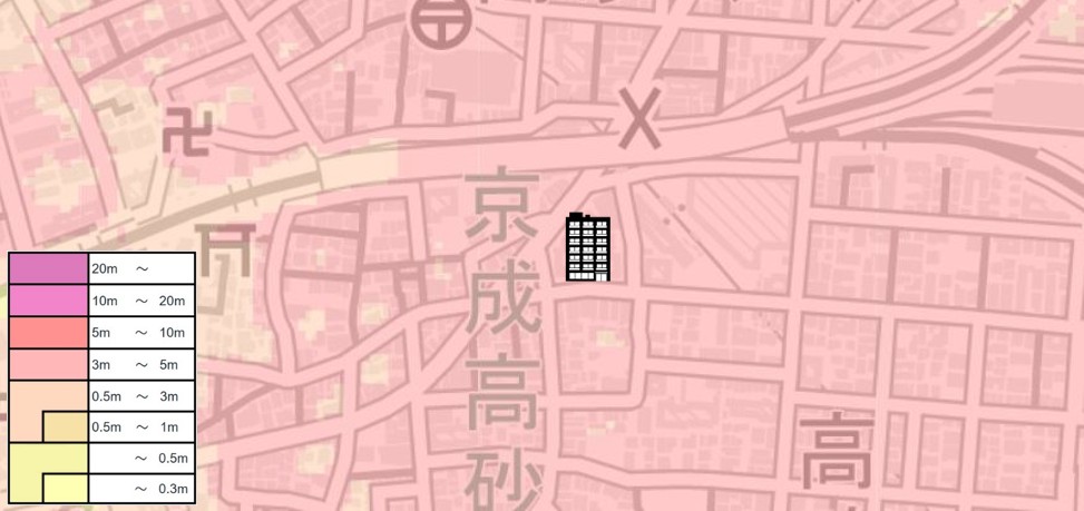 | 【対水害の評価】 [標高・地形] ●標高1m余り、東京東部の低地帯に位置します。 〔浸水深〕 ●高潮により最大約2.5mの浸水可能性が指摘されています。 ●洪水・内水氾濫により3m~5m未満の浸水可能性が指摘されています。 〔対水害総評〕 ●低地帯に位置し、3m以上の浸水可能性が指摘されているので、浸水リスクは非常に大きいです。 ●想定を超える高潮や大雨が発生した場合には、浸水被害が拡大する可能性のある立地です。 |