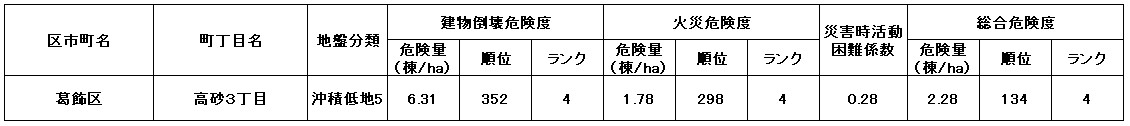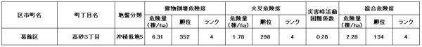 ●東京都の「地震に関する地域危険度測定調査」によると、「高砂3丁目」の地域危険度は“4”(※)であり、災害リスクが大きい地域であるとされています。