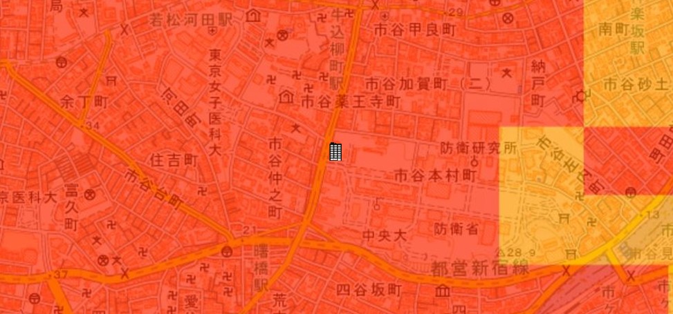 東京都の「地震に関する地域危険度測定調査」によると、「市谷本村町」の地域危険度は“1”(※)となっており、災害リスクが多少残る地域であるとされています。