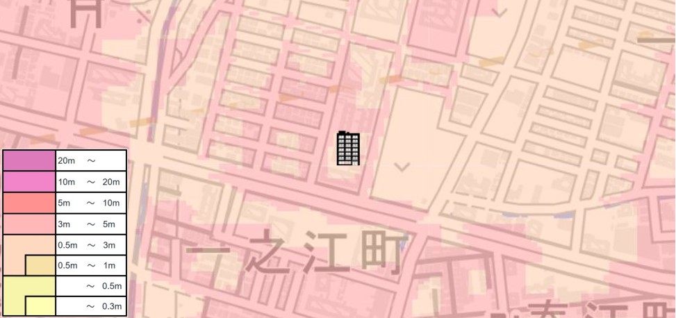 海抜ゼロメートル地帯に位置し、3m超の浸水可能性が指摘されているので、浸水リスクは非常に大きいです。