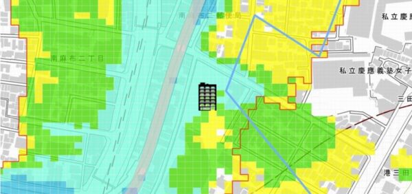 12万年前~16万年前に作られたという「埋没谷(東京層下部基底面)」の範囲に該当しますので、大地震時の揺れが大きくなる可能性があります。