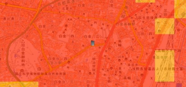 ●東京都の「地震に関する地域危険度測定調査」によると、「白金2丁目」の地域危険度は”1”(※)であり、災害に強い地域であるとされています。