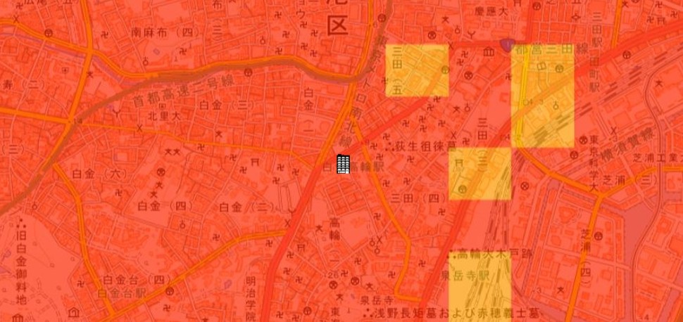 ●東京都の「地震に関する地域危険度測定調査」によると、「高輪1丁目」の地域危険度は”1”(※)であり、災害に強い地域であるとされています。