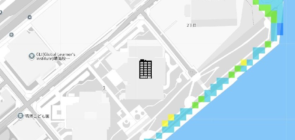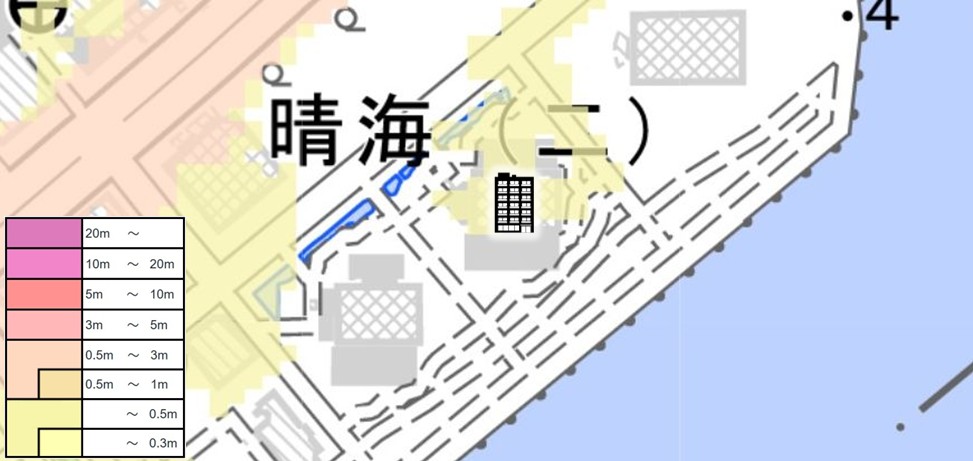 | 【対水害の評価】 [標高・立地] ●標高約4mほどの湾岸の埋立地(昭和初期に埋立)に位置します。 〔浸水深〕 ●高潮による浸水可能性は指摘されていません。 ●内水氾濫・洪水により、敷地の一部に0.5m未満の浸水可能性が指摘されています。 〔対水害総評〕 ●埋立地に位置しますが、浸水可能性の指摘は小さいので、大きな浸水リスクはないと判断します。 ●想定を超える高潮や大雨が発生した場合には、浸水被害が拡大する可能性のある立地です。 |