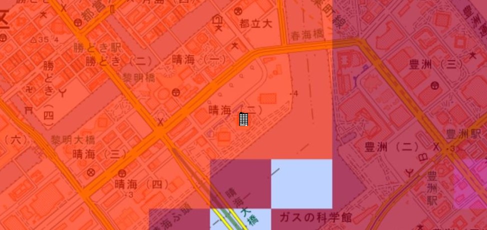 東京都の「地震に関する地域危険度測定調査」によると、「晴海2丁目」の地域危険度は“1”(※)であり、災害に強い地域であるとされています。