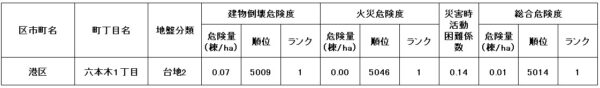 ●東京都の「地震に関する地域危険度測定調査」によると、「六本木1丁目」の地域危険度は“1”(※)であり、災害に強い地域であるとされています。